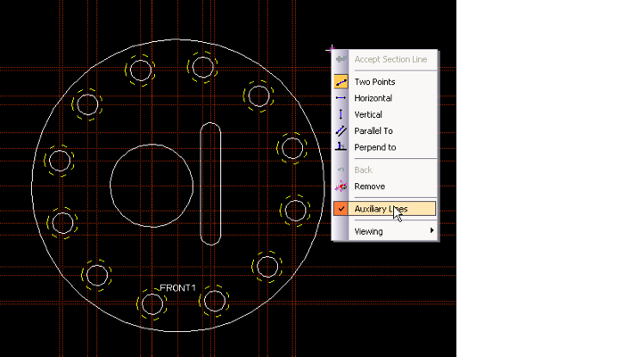 When creating a Section view in Annotation, some users have complained about all the auxiliary lines that appear. OSD puts up orthogonal lines through the centers of holes so that you can easily align your section line through the centers of holes while you create it. If you have a lot of features on the parent view, this can be a confusing mess. Also some users prefer to create their own construction geometry before creating the section view.