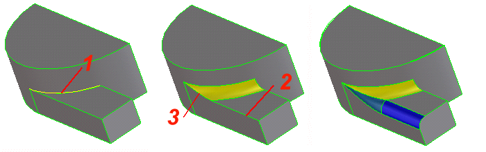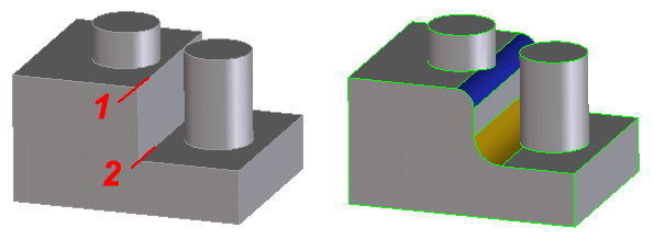 If you try to blend or chamfer two edges, one concave (1) and one convex (2), that meet in one vertex, SolidDesigner rejects the blending/chamfering task, because the common vertex region would be too complex. (Note: As of release SolidDesigner 2001, this workaround is no longer necessary when blending convex/concave edges. However, since it is still valid for chamfering and for the benefit of existing users, it is included for completeness.)