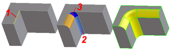 If you try to blend or chamfer two edges, one concave (1) and one convex (2), that meet as tangents at one vertex, SolidDesigner prompts with an error message. You need a third edge, to solve this task. In some cases, however, this third edge is a tangential edge or does not exist at all. See the graphic below for an example. (The note in tip 3 is also valid here.)