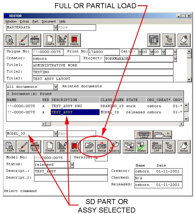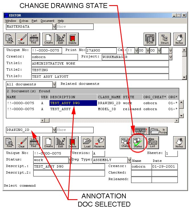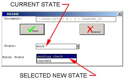 To take a document from a work state through the release state requires that you specifically choose to make a change to the state. First locate the document in the editor for which you wish to change state. Hit the States button to pop up a dialog giving you the allowed state changes. The allowed states will depend on your permissions in the system as well as what the current state is for the document. Select the desired new state and hit Okay. Note that changing the state for a drawing does NOT change the state for the associated detail 3D part or 3D assembly. It is up to the user to release the 3D documents at the same time the 2D documents are released. Similarly, changing the state of a specific 3D assembly document does NOT change the state for sub-assemblies or parts. It is up to the user to release sub-parts and/or sub-assemblies when it is desired to do so. You will probably want to update