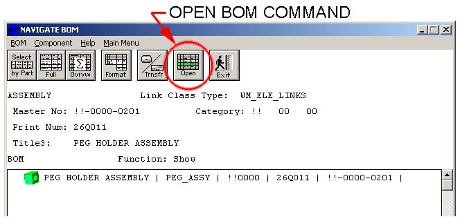 - The Navigate BOM window is used to view existing BOM structures, or to open an existing BOM to make changes to it. To make a new BOM, use the Open command, identify your target assembly, and hit Okay.