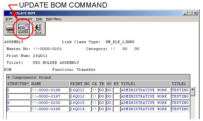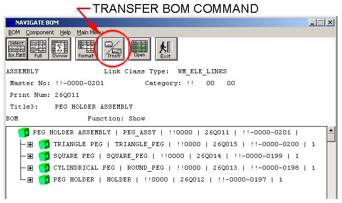 - Use the Transfer button to access the Update BOM command. The Update BOM command is used to push the BOM you