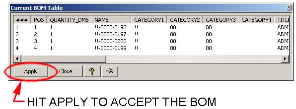 - The Update BOM sends the BOM information into SolidDesigner and pops up a Current BOM Table dialog. Accept the new BOM