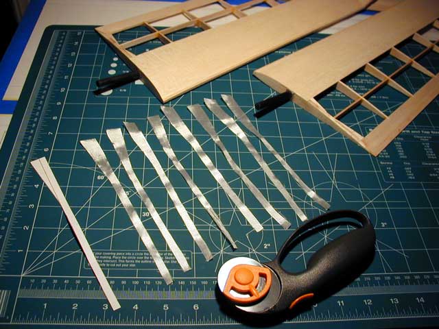 Locate the carbon cap strips for the mid panels that you cut when you built the tip panels. Cut .014 inch mylar strips the exact same size as the mid panel lower cap strips.