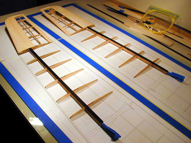The fifth ribs in your rib set will be cut in half and installed at the dihedral break after the spar is wrapped; set them aside for now.