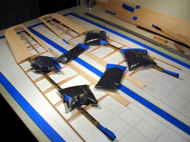 A continuous layer of bricks down the length of the spars ought to do for weight.