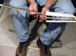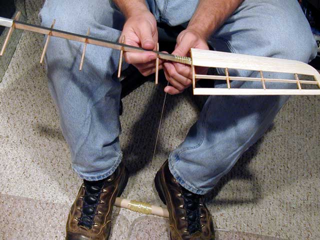 Hold the dowel to the floor with your feet to control the tension while you use both hands to carefully wrap the spar, flattening out the tow to a 1/8 inch ribbon as you go.