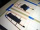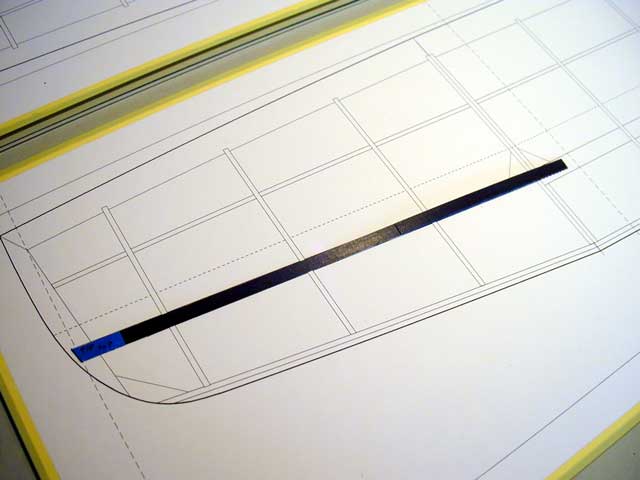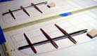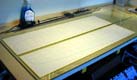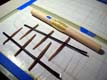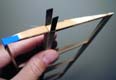 5. Place wax paper over the plans and tape securely around the edges. Lightly mist the back of the Mylar strips with spray adhesive and smooth over the plans. Let the extra length overhang onto the mid panel layout. Wax the strips to prevent sticking and let dry. VERY lightly mist the bottom spar cap and smooth it over the Mylar strip, taking care to place the end precisely at the dihedral break. The purpose of these light mist coats is to prevent the Mylar strip and lower cap strip from sliding around while you work.