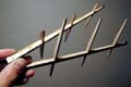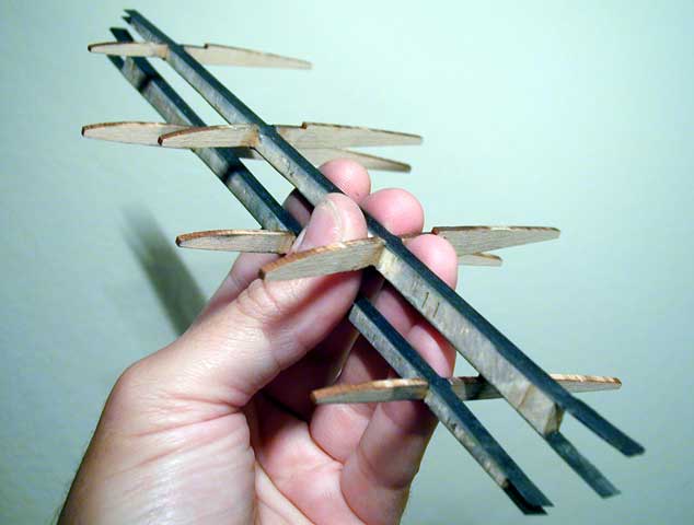 Notch the TE strip. To form the notches, create a notching tool by gluing a 3/32" strip of sandpaper on to the edge of a piece of 6 x 1 x 3/32" hard balsa scrap. Sand the 1" face of this tool down until sanding with the 3/32" edge makes notches which form a friction fit with the rib material. Position the notches so that the ribs seat into the strip about 3/32" - you may need to trim off the TE ends of the ribs slightly.