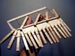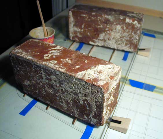 Place the 12 degree angle jigs, one at each spar end on top of the lower spar cap carry through segment, forcing the two upper carry through segments to bend up at the proper angle. Use a brick to hold the two jigs in place at the end of the spars, if necessary. Use a popsicle-stick to gently press the two upper spar cap carry through segments together to squeeze out any excess epoxy. You may find that the angle jig is lifting part of the carry through segment and spar cap off of the basswood insert. In this case, place a piece of popsicle stick or other suitable scrap just under the polyethylene foam right at the end to hold it down to the insert.