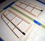 1. Lightly mist the back of your wing plan with spray adhesive and let thoroughly dry - an hour would be good for regular spray adhesive. If you really plan on reusing your plans, use 3M Spray Mount repositionalble spray adhesive instead. (See the Building the Center Panel for the results of using Spray 77 instead of Spray Mount.) 3M Spray Mount is available in large cans at art supply stores. The purpose is to allow you to hold the plans to your glass building surface, but allow removal later. An alternative approach is to spray your glass building surface with repositionable spray adhesive. In this case, there will be no residue left on your plans, but you will have to clean the gunk off your glass eventually. For wing plans, print out the Full Size Postsript version, or visit the AllegroLite Home Page for 8-1/2" x 11" piece together PDF version.