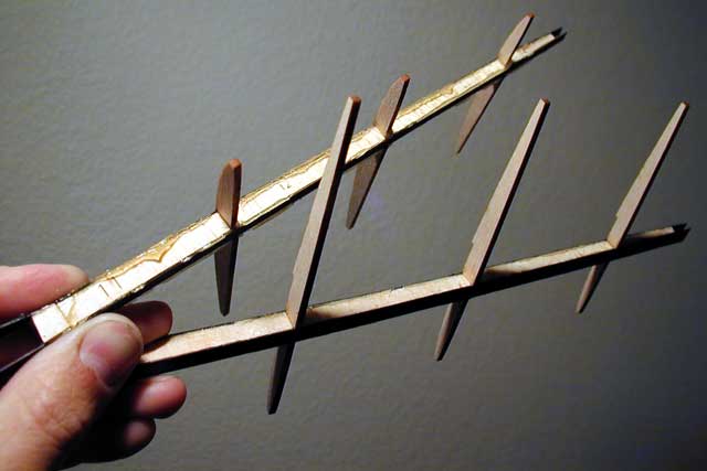 Following the plan, trim away a portion of the 1/8" thick part so you end up with a taper, about 11/16" wide at the break point and about 1/2" wide at the tip. Bevel this composite TE strip so that the thicker part is close, but not all the way down to the height of the TE ribs.