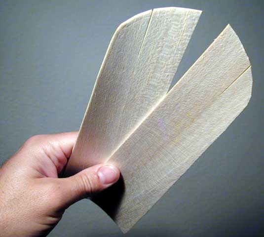 Prepare two end-grain basswood inserts (one each for left and right tip panels) to replace the 3/8" portion of the spar web that is closest to the break (number 11) - use a piece of the 1/4 x 3/4 x 18" basswood stick. The face of the insert at the break should be beveled to 6 degrees; you may want to make a 6 degree angle jig to facilitate this. Shorten the web by the same length as your insert. The webs are tapered, so shorten the correct end!