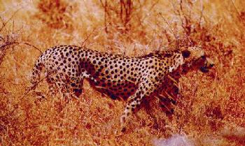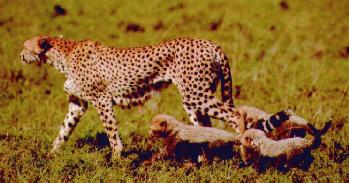 Cheetah cubs learn to hunt by watching mom. Unfortunately, though fast, Cheetahs are not very aggressive and often loose their kills to hyenas or other aggressive animals. This leads to high mortality rates for Cheetah cubs. And of course the ever dwindling territory where Cheetahs roam implies that, like many of Africa's majestic animals, the Cheetah will soon be seen only in zoos.