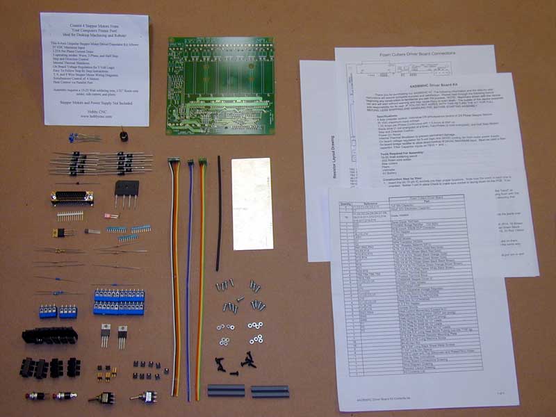| The www.hobbycnc.com driver board with heat and aquisition kit includes the PCB board, driver ICs, timer IC, voltage rectifier and regulators, diodes, capacitors, resistors, and switches. It does not include the ballast resistors (which vary depending on the steppers), but does include the mounting hardware for them. |